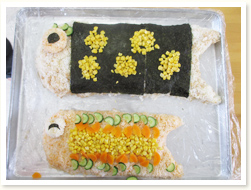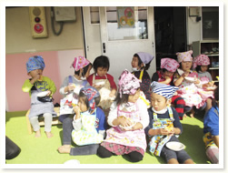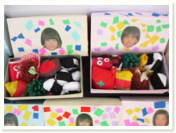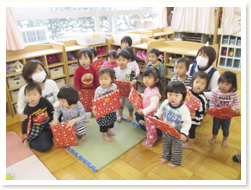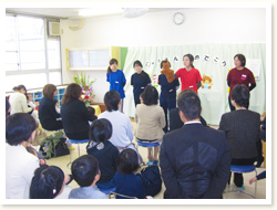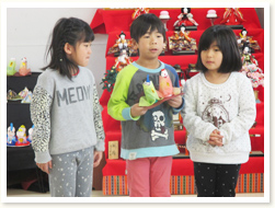 各クラスでつくったおひな様のつくり方を 説明してくれました。 幼児クラスは、細かくつくり方を説明してくれました。