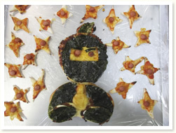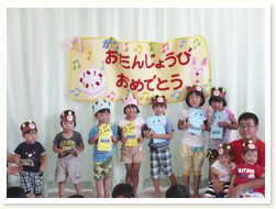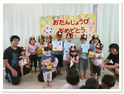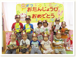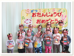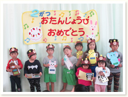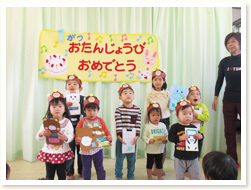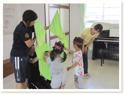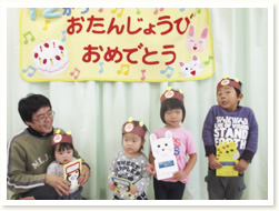 「へんしんはっぱシアター」で、 誕生児さんは、はっぱをいろんな形にかえ、 「これはなんでしょう」とクイズを出していました。