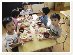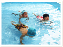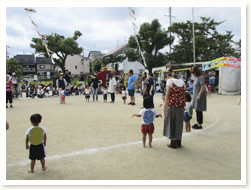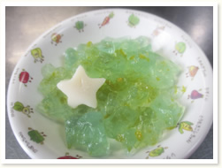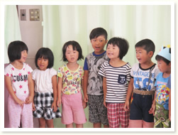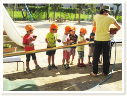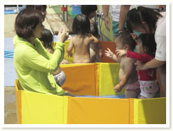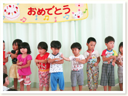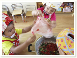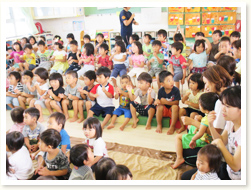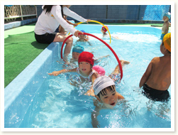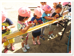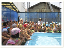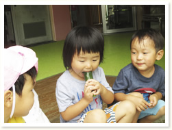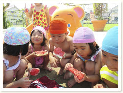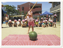 プールびらきの日に、 すいかわりもたのしみました。 大きなすいかはなかなか割れず、 割れたときには、「やったー」と、 とびあがってよろこんでいました。
