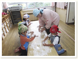 自分でついたおもちを丸めました。 大きなまるもちができあがりました。