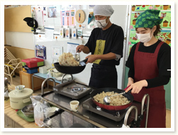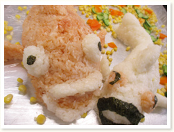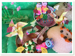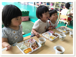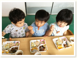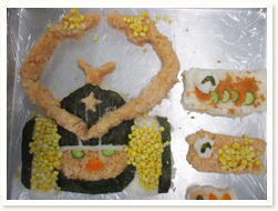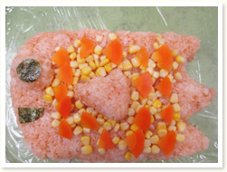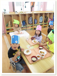 〈こどもの日メニュー〉 「わぁ!凄い!」と、こいのぼりご飯に大人も子どもも大喜びでした。 3歳児さんは、自分たちで作ったこいのぼり帽子をかぶっての昼食となり、 おいしさも倍増のようでした。