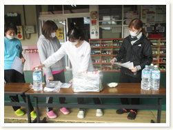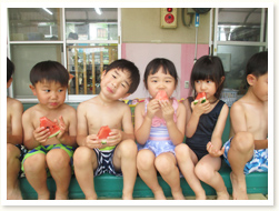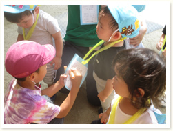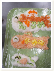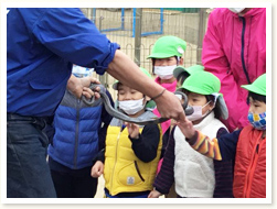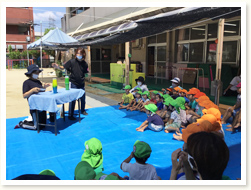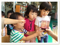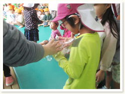 地震の避難訓練後、火も水道水も使わずに出来る 防災用ごはんの作り方を教えてもらいました。 幼児クラスはサランラップにご飯をのせてもらい、 自分で握って食べる経験もしました。