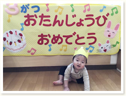 クラスのみんなにお祝いしてもらいました。 かんむりをかぶって嬉しくて、にっこり! 0歳ひよこぐみのお友だちは、初めてのお誕生日会です。